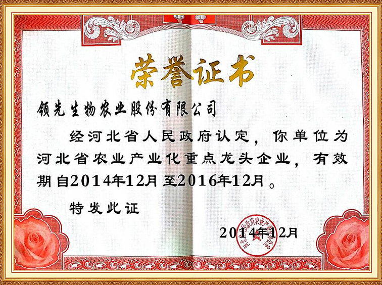 河北省农业工业化重点龙头企业证书
